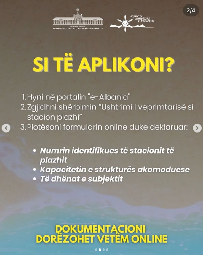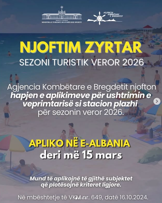 🔶Njoftojmë hapjen e aplikimeve për ushtrimin e veprimtarisë si stacion plazhi për sezonin turistik veror 2026.