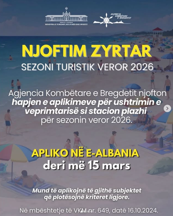 🔶Njoftojmë hapjen e aplikimeve për ushtrimin e veprimtarisë si stacion plazhi për sezonin turistik veror 2026.
